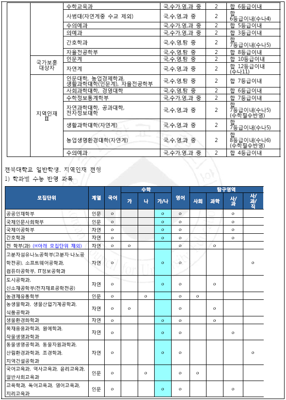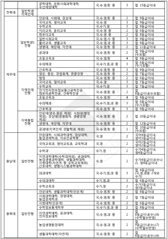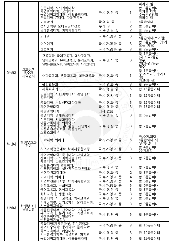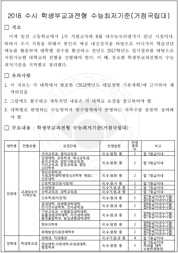 [2018학년도] 거점 국립대 학생부교과 수능최저등급 요약