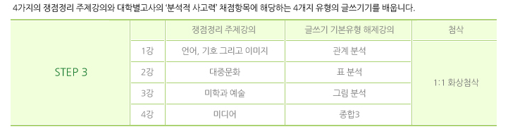 | 수강대상 | ▩ 논술을 처음 시작하는 고3/N수생 ▩ 기출문제만 풀어 개념이 약한 고3/N수생 ▩ 명문대를 목표로 논술 선행을 준비하는 고1.2 생 |